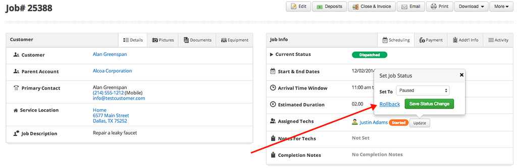 If a tech accidently chooses the wrong job on his Field Worker App, and presses the Status button, and it changes from Dispatched to On the Way, or any other scenario that might come up where you would have to change the status to it original stage. We now have a Rollback option to all open jobs. When you are looking at the Job screen in the Job Info section, in assigned tech field, next to the techs status, there is a Update tab. Click on it and a small window will pop up. Bottom left there would be a link named Rollback. Click on it, and it would allow you to go back to whatever status this job needs to be.