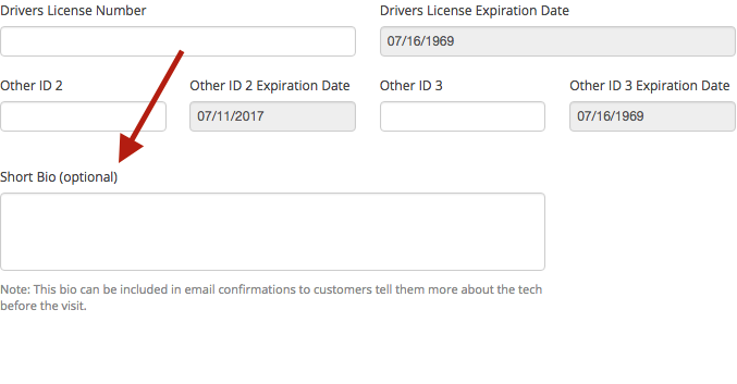This bio can be included in email confirmations to customers tell them more about the tech before the visit. We have set the character limit to 255. The tag will be +BioFor example:{Job:TechsAssigned+Phone+Email+ProfilePicture+Bio}.