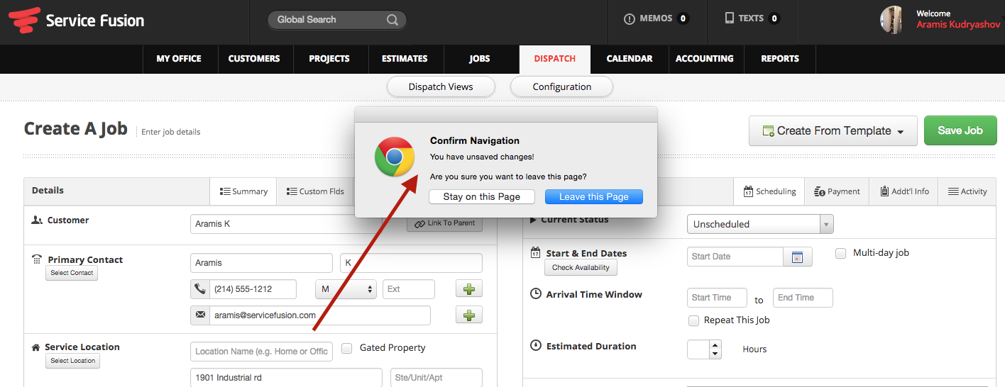 3. The Job Details view popup from Dispatch and Calendar listed the street address twice