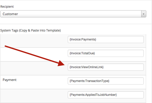 You would need to copy and paste this tag into your invoice template. This tag will generate a link. When a customer clicks on this link they will be able to see the invoice as if it was the printable version of the invoice and a Pay Now Online button to the right of the invoice.