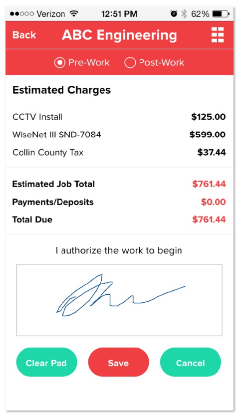 The pre and post work signatures are now included on printable and PDF versions of work order forms. When emailed or attached to an invoice, the signatures are automatically populated into the document.