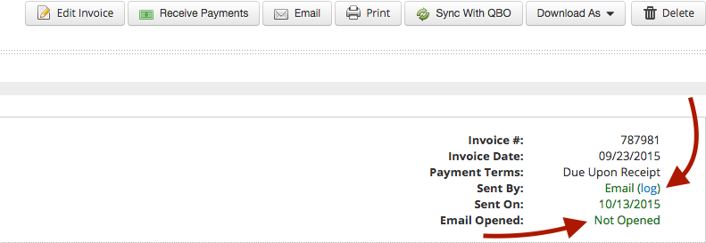 On the invoice side, on the upper right hand side we have added an option that tells you if the email was opened or not and a link to a log where you can view the content of the email.