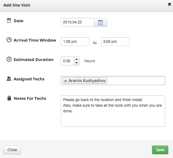 You can chose any date and time, select multiple techs if needed and include notes for tech. So basically you are creating a job within a job.